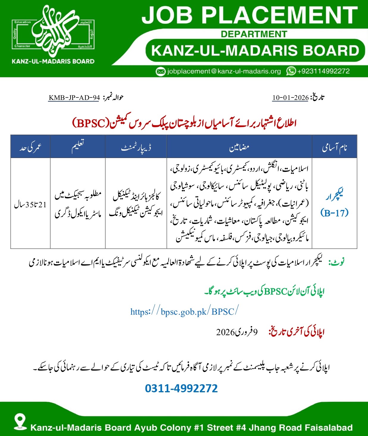 Lecturer Jobs in Balochistan Public Service Commission (BPSC)