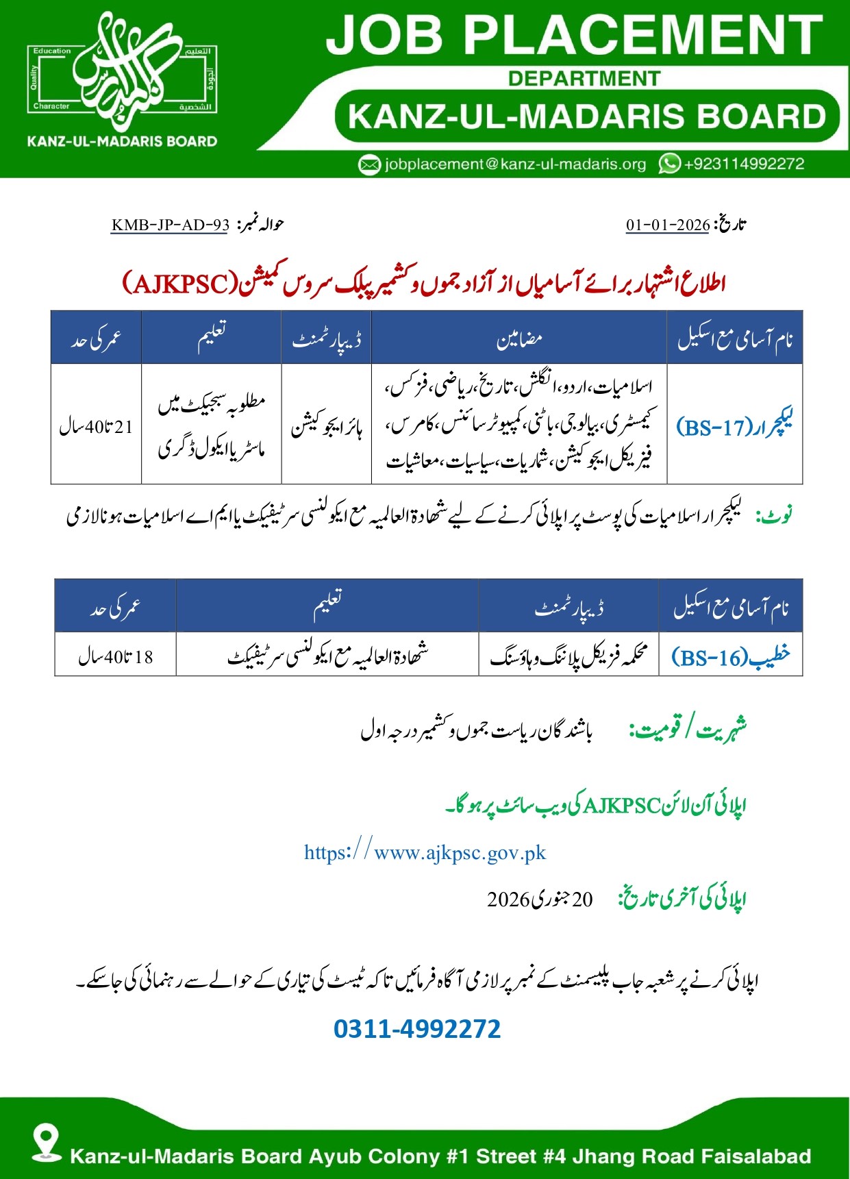 Lecturer and Khateeb Jobs announced by AJK Public Service Commission (AJKPSC).